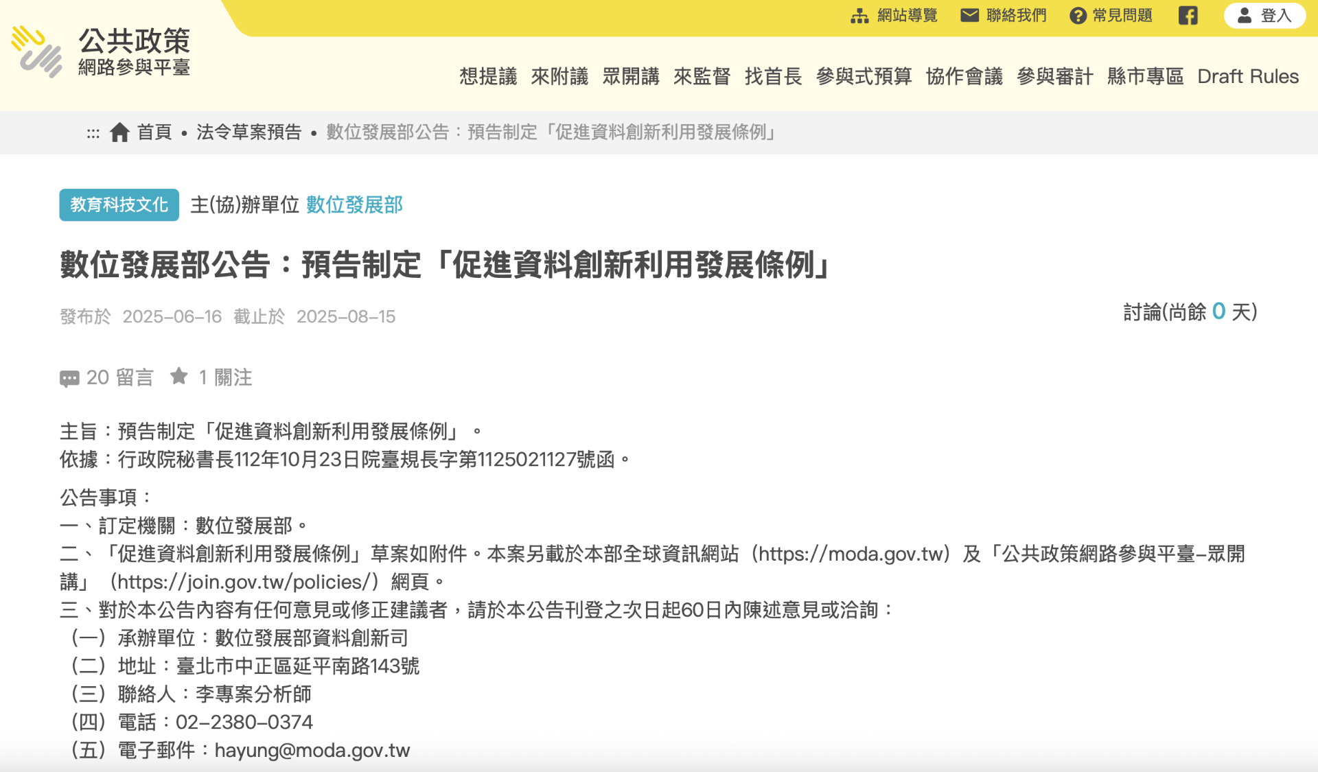 茲對數位發展部預告之「促進資料創新利用發展條例草案」(以下稱「本草案」)表達意見如下: